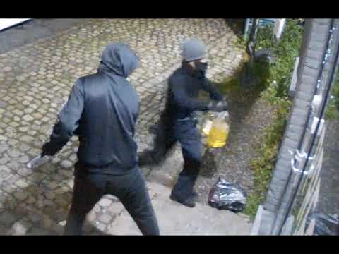 De 1e dader is in het bezit van een voorhamer. Op het ogenblik van de feiten droeg hij een zwarte trainingsbroek van het merk "Adidas" met paarse lijnen op de zijkant en het logo van "Juventus". Hij droeg ook een zwarte sweater met kap met een witte lijn.